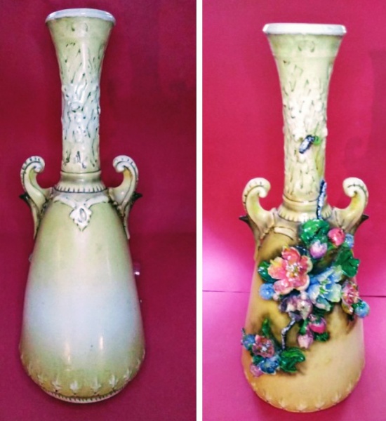 • Fabuloso vaso em faiança italiana, do Séc. XIX, na cor Pastel, todo decorado com flores, ramagens em relevo, ricamente policromados. Peça de coleção. Med.: 39 x 16 x 16 cm.