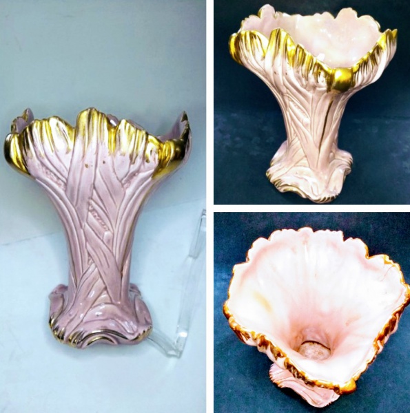 • Belo antigo vaso em louça  , em formato de tulipa rosa ocre com bordas em dourado , com 14 x 14 x 18 cm de alt