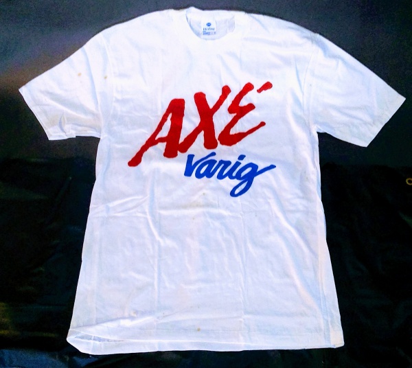 • Rara camiseta AXÉ VARIG , em branco escrita em azul e vermelho  ,( HERING ) tamanho X G  , para colecionadores de plantão, OBS pequenas bolinhas de ferrugem , necessita lavagem .