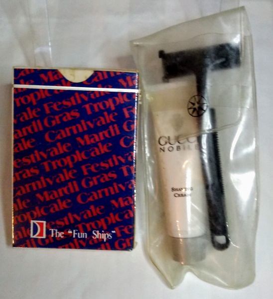 • Raro Lote Duas peças, BARALHO DA CARNIVAL CRUISE LINES 9x6,5cm  ,KIT DE BARBEAR COM GILETE E CREME PÓS BARBA DA GUCCI Medidas Kit 14x6 cm Para Colecionadores De Plantão.