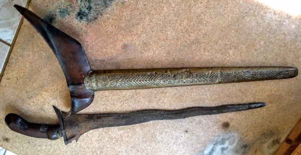 • Antiga  adaga bainha em latão cinzelado cabo em madeira e protetor de mão revestido em  couro Tamanho da Lamina 33cm                                                                                                              Peça está em SP , na cidade de Américo Brasiliense .