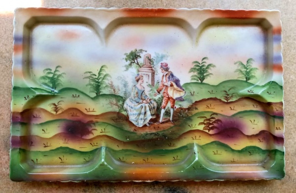 • Antiga Bandeja Faiança retangular , tema galanteio .med 30 x 19 cm                                                           Peça está em SP , na cidade de Américo Brasiliense .